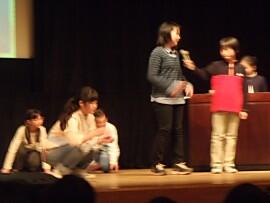実際に仲田小学校の発表が始まると、これまでの練習通りに一人一人がスムースに交代しながら、水田学習について学んだことを順に話すことができました。特に、発表の後半で出したクイズに対しては、会場にいる子供たちが真剣に聞いているのがよく分かりました。発表の内容がわかりやすかっただけでなく、一部インタビューを劇化する部分を入れたり、クイズを取り入れたりしたので、聞いている人にはプレゼンテーションとしてとてもよくできていたと感じました。一緒に会場にいらしていた日野第一中学校の石村校長先生からも賞賛のお言葉をいただきました。ありがとうございます。