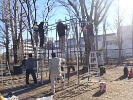 去る1月17日(土)の午後、開校30周年記念の最後の事業、「遊具ペンキ塗り」の2回目の作業を行いました。今回も30人を超える保護者の皆さんにお集まりいただきました。