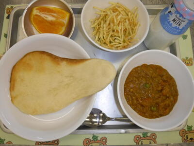 ナン キーマカレー じゃがいものハニーサラダ デコポン 牛乳