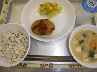 ごまご飯 こまったさんのカレーツナコロッケ キャベツの塩もみ 具沢山呉汁 牛乳