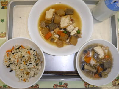 えのきとじゃこのわかめご飯 豚肉と大根の煮物 芋っこ汁 牛乳