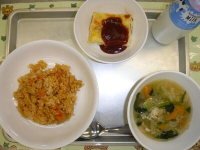 ジョロフライス ベーコンチーズオムレツ レンズ豆のスープ 牛乳
