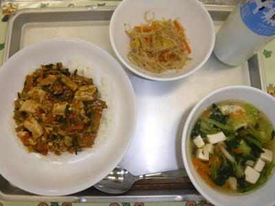 マーボードウフ丼 中華サラダ 小松菜のスープ 牛乳