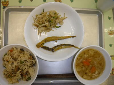 鶏五目ご飯 ししゃものカレー揚げ もやしとちくわの和え物 田舎汁 牛乳