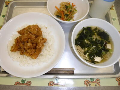 ちくわと大豆のバラ天丼 野菜のからし和え すまし汁 牛乳