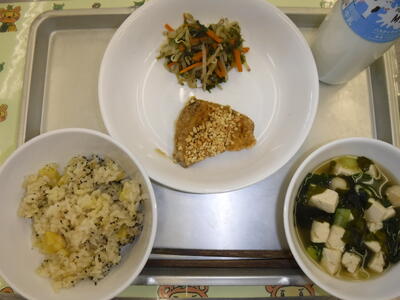 芋栗ご飯 もうかさめのナッツだれかけ 野菜の海苔酢和え すまし汁 牛乳