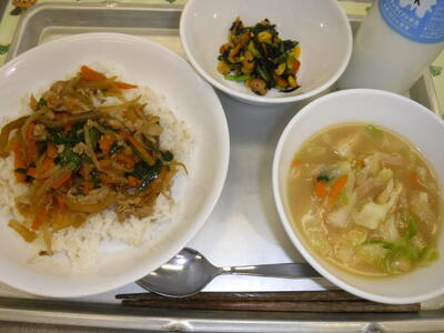 スタミナ丼 鉄骨サラダ キャベツの味噌汁 牛乳