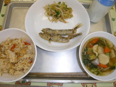 切り干し大根ご飯 ししゃもの唐揚げ もやしのごま酢和え すいとん 牛乳
