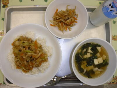 ホイコーロー丼 もやしナムル 豆腐入りわかめスープ 牛乳