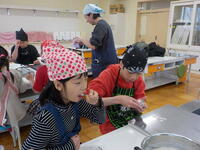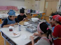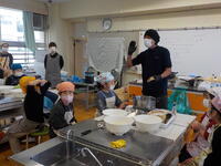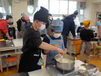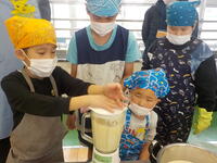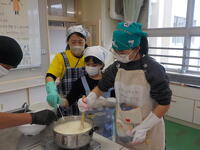 なのはな学級では2学期に「百草食品」のお店にうかがい、豆腐を作っているところを見せていただいたり、仕事の内容などを教えていただいたりしました。それからは、なのはな学級の児童にとって身近になった「百草食品」のお豆腐。今回は、ゲストティーチャーとしてお店の皆様にご来校いただき、「豆腐作り体験」を実施していただきました。