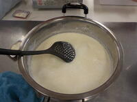 保護者の皆さんも一緒に、それぞれの班で豆腐を作る工程を一つ一つ体験していきました。一晩水に浸しておいた大豆を水と一緒にミキサーにかけ、どろどろの「生呉(なまご)」にし、鍋に移して火をかけて5分ほどで40度くらいの熱さになるまで煮ます。煮た「呉(ご)」を布の袋に入れて絞って「豆乳」と「おから」に分けます。豆乳は、85度まで煮てからにがりを入れて固め、型に入れて木綿豆腐におからは片栗粉を混ぜてこね、成形した後に油で揚げておからもちになりました。