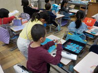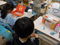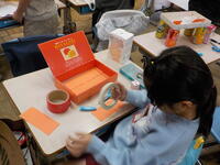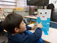 はこの形からイメージできるものとして、「いれもの」「すごろく」「ろぼっと」「いきもの」など、思い思いに作品をつくっていきました。「はこの色が全体的に白いから、青のテープをつけて色の違いを出してみた。」など、工夫して作品をつくっている子供たちの声が聞かれました。