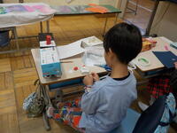 展覧会から早いもので半月が過ぎました。展覧会後の1年生の図工では、「はこをつかって」と題し、お家からもってきた様々な形の箱や空き缶などを使っての作品作りです。