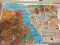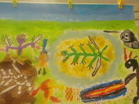 4年生の図工では、「よみがえる きょうりゅうたち」という題名での平面作品に取り組んでいます。化石から恐竜がよみがえった様子を創造する作品で、子供たちは図工室にある恐竜のおもちゃや本などを参考に思い思いの世界をイメージしながら仕上げています。