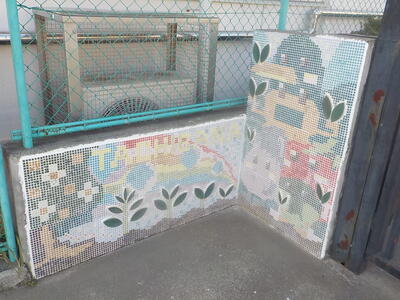 これからも同じ地域、そして一緒になった仲間として交流を続けていきたいと思います。(写真は、八小の正門前に飾られている「たちばな学級の仲間」というタイルアートです。)