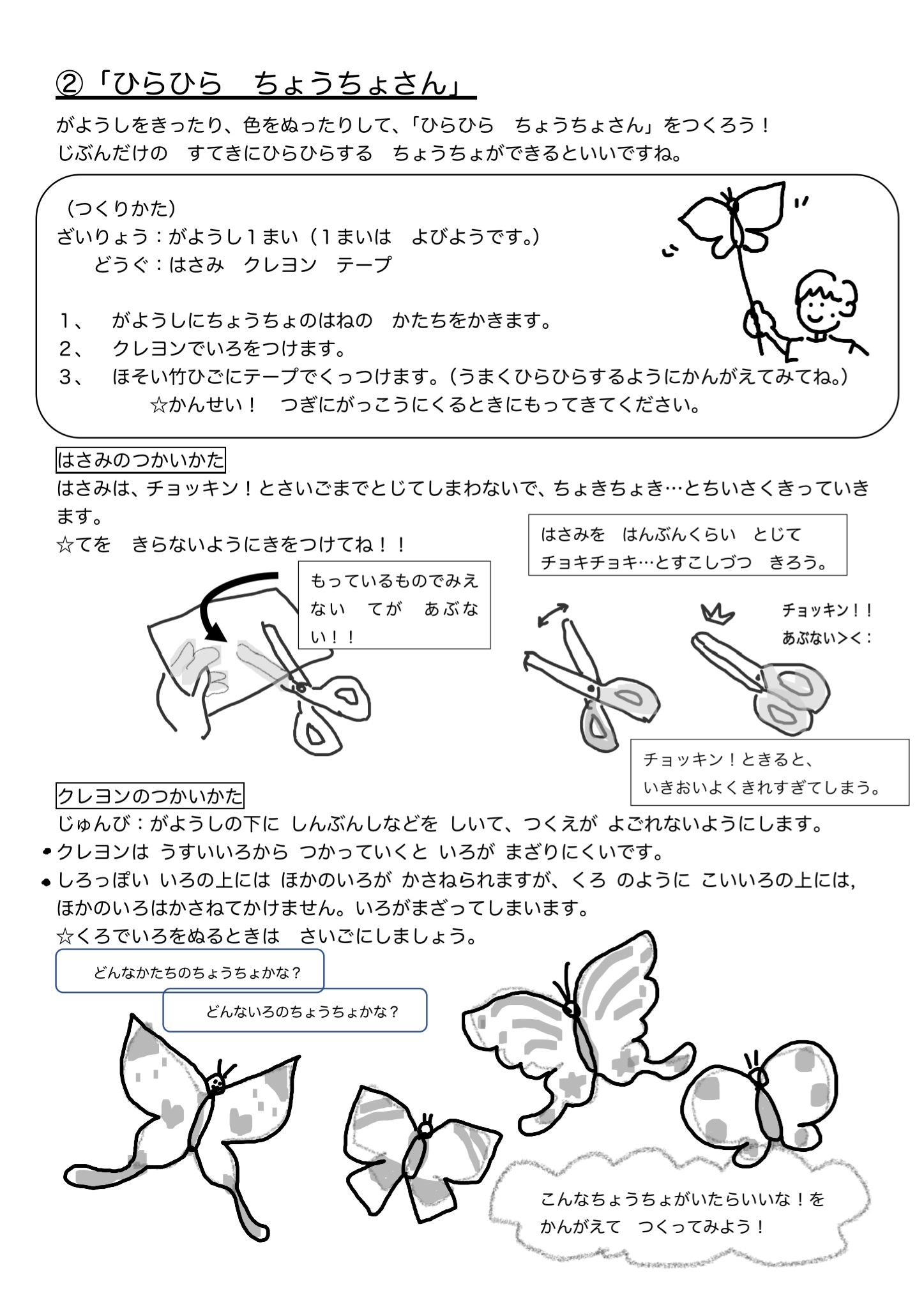 画用紙を二つに折って片方の羽を書いて重ねて切ると左右対称のちょうができますが、今回は二つに折ってつくっても、そのままかいてもいいと児童に伝えました。