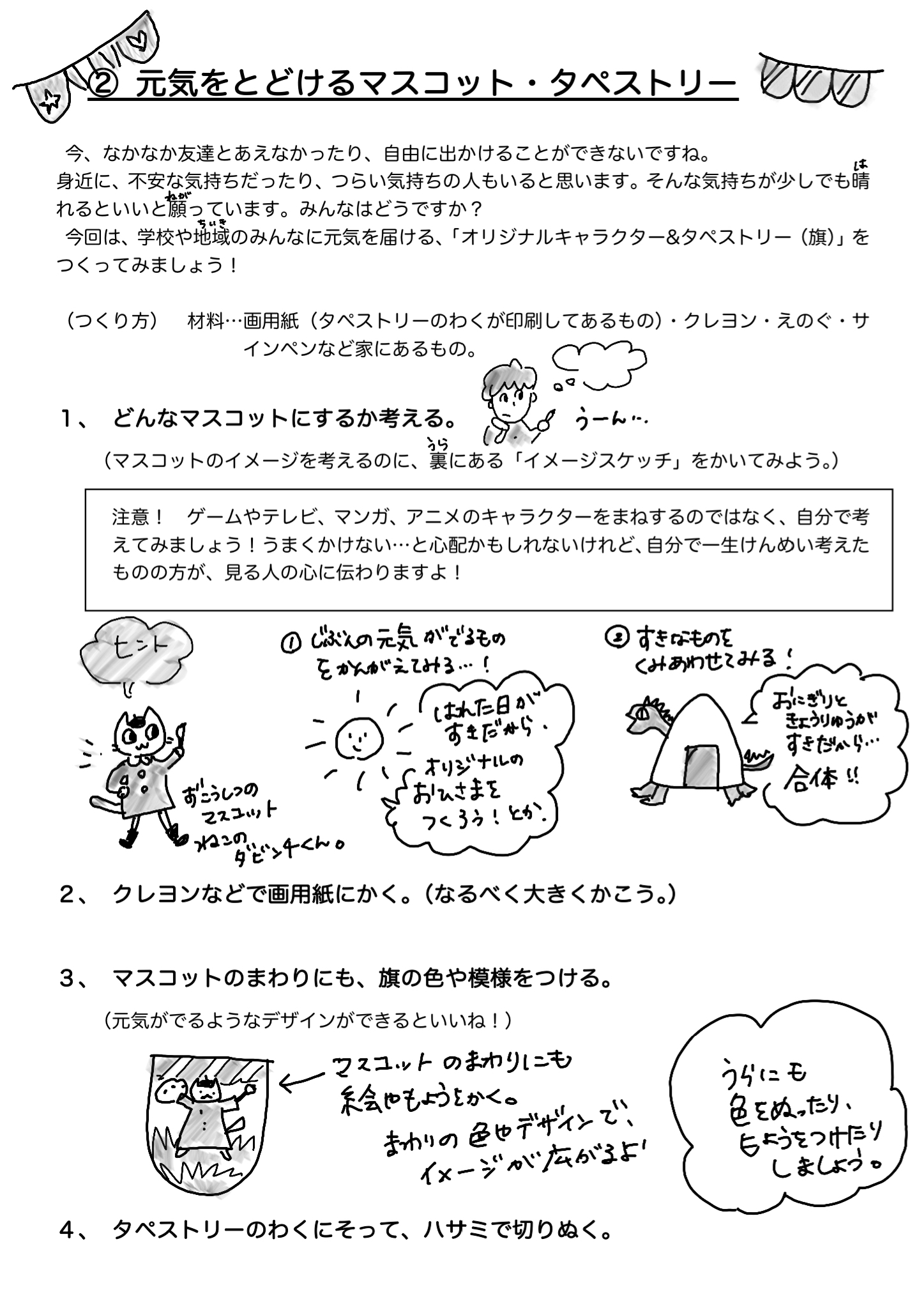 自分の考えたマスコットとはたで、学校や地域を元気にできたらいいなと考えて楽しんでつくってみてください。