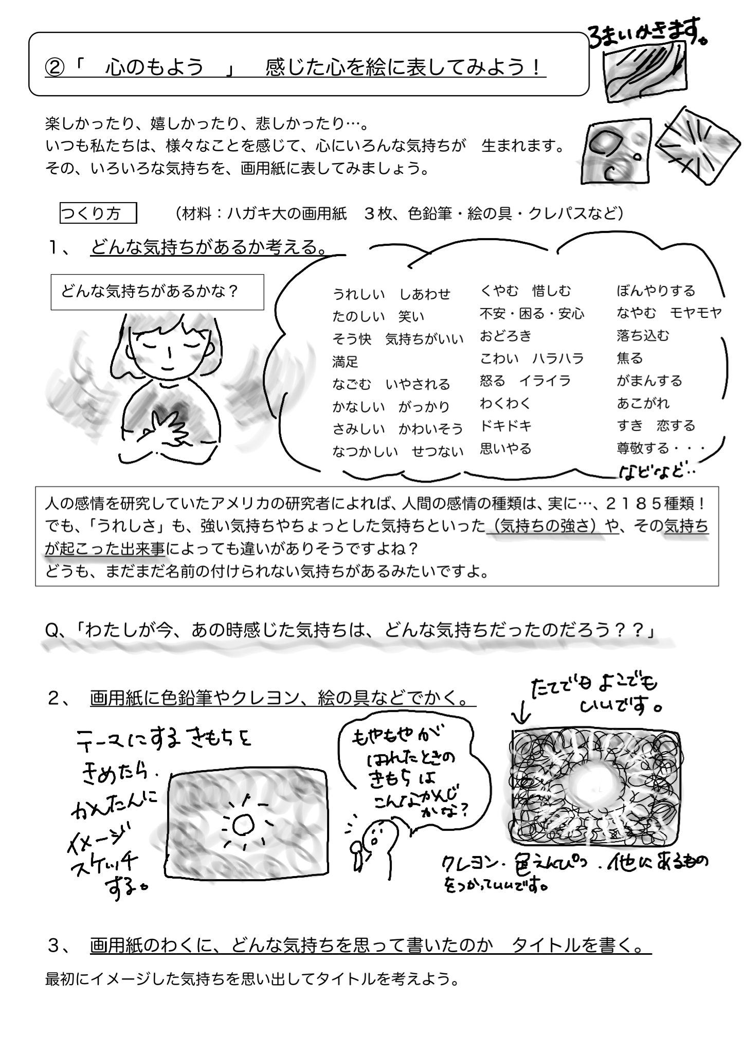 楽しい、嬉しい、悲しい、怒り、私たちの心は様々なことを感じて、いろんな気持ちが生まれます。その様々な気持ちを、形・色を考えて絵にあらわします。