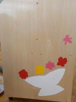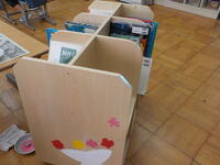 今年の4月、なのはな学級の開級に伴い、これまで使っていた本棚がロッカーになったり、新たに本の数が増えたりと本を配架する場所が限られてしまいました。さらに子供たちが本を読みたても、読みたいを本を選ぶための移動が大変でした。そこで、市庶務課業務サポートチームの方々に可動式本棚を作っていただき、5月から使用を開始しました。
