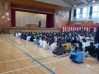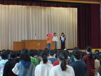 2年前の4月、皆さんが優しく私を迎えてくれたのでとてもうれしく、この学校に来てよかったなと思いました。普段の勉強や様々なことに一生けん取り組んでいる姿も私の目に焼き付いています。この優しさは皆さんの素晴らしいところです。だからこそ、今から話す2つのことがもっとレベルアップできるとよいなと思います。