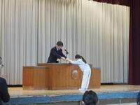そしてなのはな学級の卒業生の皆さん。皆さんはなのはな学級の最初の卒業生です。この一年、新しい仲間みんなで、仲良く楽しく過ごせるようにと先頭に立ってがんばってくれました。特に九月の宿泊学習では、自分のことだけはなく、みんなが楽しめるようにと考え、行動する姿はとても立派でした。なのはな学級の歴史の第一歩が刻まれました。本当にありがとう。