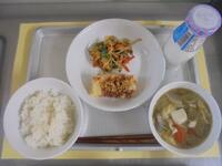 主な食材:しょうが(高知県)、もやし(栃木県)、ごぼう(青森県)、ごま(アフリカ)、こんにゃく(栃木県)、豆腐(富山県)、油揚げ(富山県)、いか(ペルー)、アーモンド(アメリカ)、にんじん(日野市旗野利之さん)、白菜(日野市旗野利之さん)、小松菜(日野市馬場雅一さん)、大根(日野市馬場雅一さん)、じゃがいも(日野市馬場昌生さん)、長ねぎ(日野市日野市馬場昌生さん)