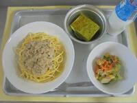 献立名:大根おろしとツナのパスタ、じゃこ入りキャベツサラダ、小松菜ケーキ、牛乳