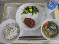 献立名:ごまご飯、ゼリーフライ、青菜とコーンの酢醤油、五目汁、牛乳