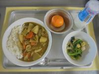 献立名:日野産カレーライス、小松菜と白菜のサラダ、みかん、牛乳