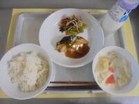 献立名:麦ごはん、鯖のピリ辛焼き、青菜のお浸し、飛鳥汁、牛乳