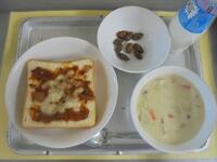 献立名:ピザトースト、白菜のクリームシチュー、黒糖アーモンド、牛乳