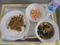 献立名:大豆とごぼうのそぼろ丼、かぶの甘酢漬け、わかめの味噌汁、牛乳
