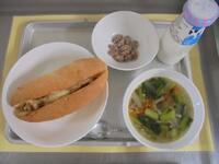 主な食材:玉葱(北海道)、じゃがいも(北海道)、アーモンド(アメリカ)、豚肉(沖縄県)、ベーコン(茨城県)、大豆(北海道)、小松菜(日野市旗野利之さん)、にんじん(日野市旗野利之さん)、にんにく(日野市旗野利之さん)