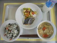 献立名:わかめご飯、さわらの照り焼き、野菜ののり和え、すいとん汁、牛乳