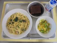 献立名:ほうれん草とベーコンのスパゲティ、バジルサラダ、ごぼうのブラウニー、ジョア