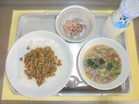献立名:大豆とごぼうのそぼろ丼、沢煮椀、シナモンアーモンド、牛乳
