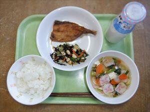 ごはん、いわしのかばやき、大豆とひじきのあえもの、鬼かまぼこ入りすまし汁、牛乳