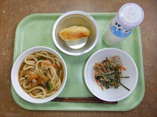 カレーうどん、野菜の磯香あえ、スイートポテト、牛乳