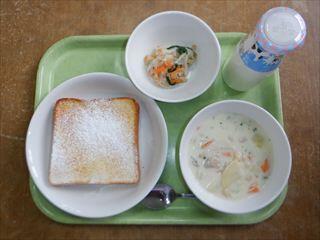 無塩パンのフレンチトースト、お豆の入ったクリームシチュー、大根のマリネ、牛乳