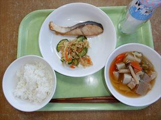 ごはん、いなだの照り焼き、切干大根のはりはり漬け、いものこ汁、牛乳