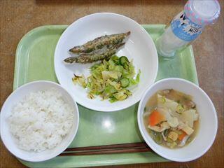 ごはん、ししゃもの磯辺揚げ、キャベツの昆布和え、豚汁、牛乳