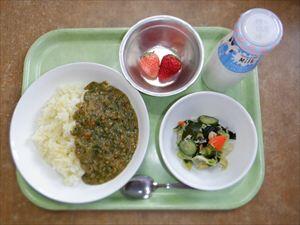 こまつなのドライカレー、じゃこ入りわかめサラダ、いちご、牛乳