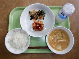 ごはん、つくね焼き、大根とわかめの和え物、みそ汁、牛乳