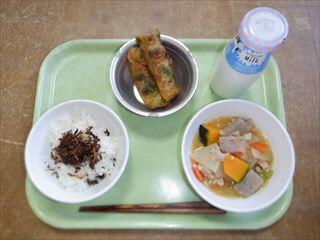 ごはん、ゆずちりめんふりかけ、竹輪の磯辺揚げ、南瓜の豚汁