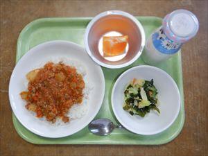 野菜ゴロゴロ!ミートソースライス、わかめサラダ、かんぺい、牛乳