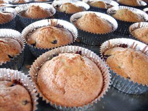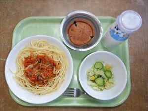 スパゲッティアラビアータ、コーンサラダ、ブルーベリーケーキ、牛乳