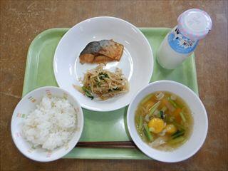 ごはん、さばのみそ焼き、もやしとチンゲン菜のおひたし、月見団子汁、牛乳