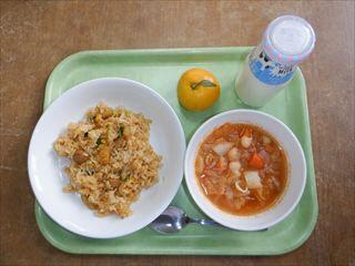 スパイシーピラフ、かぶとベーコンのミネストローネ、みかん、牛乳