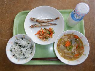 わかめごはん、ししゃものからあげ、切干し大根のはりはり漬け、さつま汁、牛乳