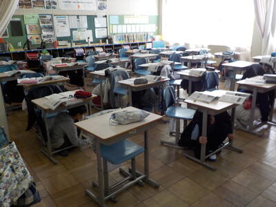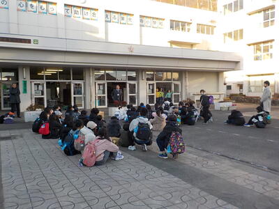 7月の避難訓練は、台風接近に伴って雨風が強まることを想定し、全校児童が通学路ごとに一斉に下校する一斉下校訓練を実施しました。通学路ごとに教員が同行し、風水害に対する心構えをもたせ、普段何気なく通っている道がどのように変化するかを考えさせながら下校しました。